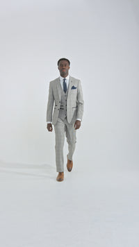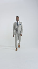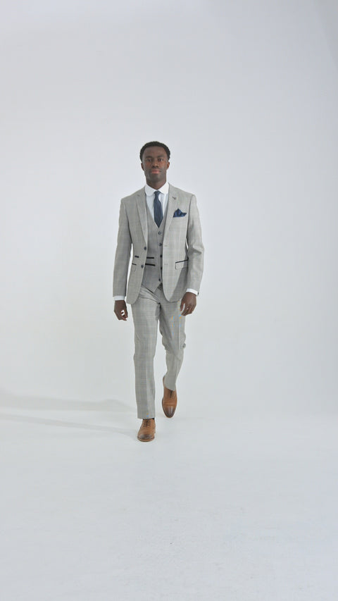 Hugo Men's Light Grey 3-Piece Suit with Navy Blue Check and Velvet Trims